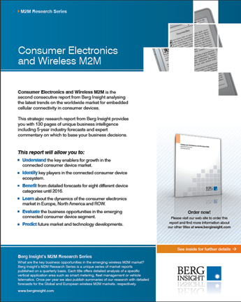“Cellular connectivity gives the freedom of being connected everywhere and there are already 12.7 million consumer M2M devices in use worldwide” says Johan Svanberg, Senior Analyst, Berg Insight. Consumer awareness, decreasing prices of modules and chipsets together with massive global deployments of high speed cellular networks such as LTE will have a positive impact on the market. “In a not too distant future, a substantial part of all content and services will be delivered through mobile channels. All companies, from device vendors, content owners to service providers, need to prepare for this change and have a well thought out mobile strategy in order to stay relevant”, added Mr. Svanberg. You can download the report brochure, Consumer Electronics and Wireless M2M, at this direct link.