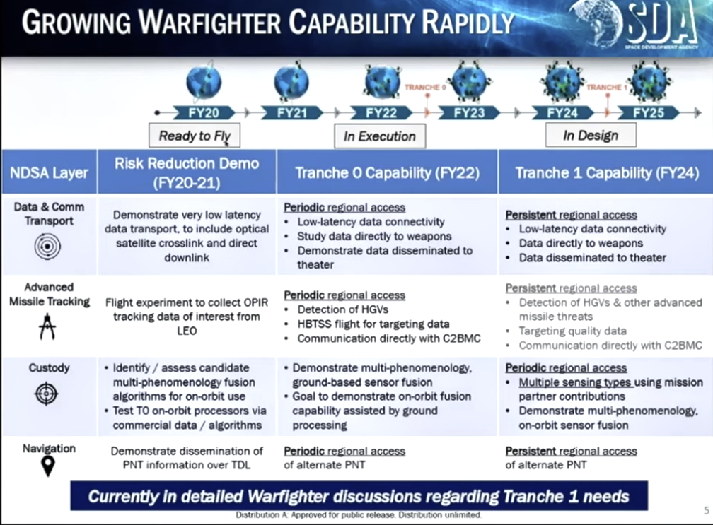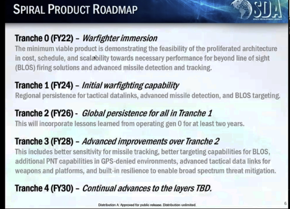 Let’s talk about the grand vision overview of what capabilities and product we plan on fielding in the future. We view this as our product roadmap. For Tranche 0 has gone into the detail box, what capabilities will be included in that product. Tranche 1, a little about the details there as far as what capabilities we provide to include in that product as a minimal, viable product. But then, for Tranches 2 , 3, 4 and 5 on out, this is the product roadmap. If folks are looking at what we should be investing in, in industry, to make sure that we can come up with a product that we can sell to the Space Development Agency that they will include in their Tranches that is necessary for the warfighter, this is essentially the product roadmap that you could use for investment.