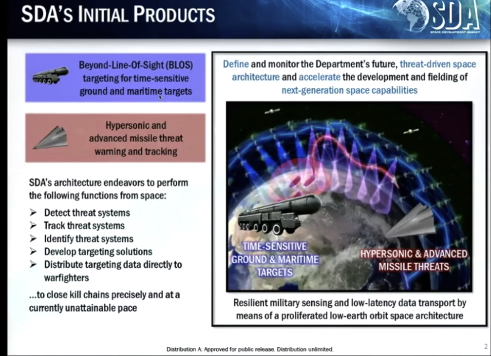Product #2 is to be able to do that exact same mission as Product #1 except now, instead of mobile missiles and ships, I want to be able to do that for advanced missiles, so hypersonic glide vehicles and those types of things. Detect them, track them, calculate a fire control solution and give it to the warfighters. Those are the products that the SDA is focused on delivering for the warfighter in the future.