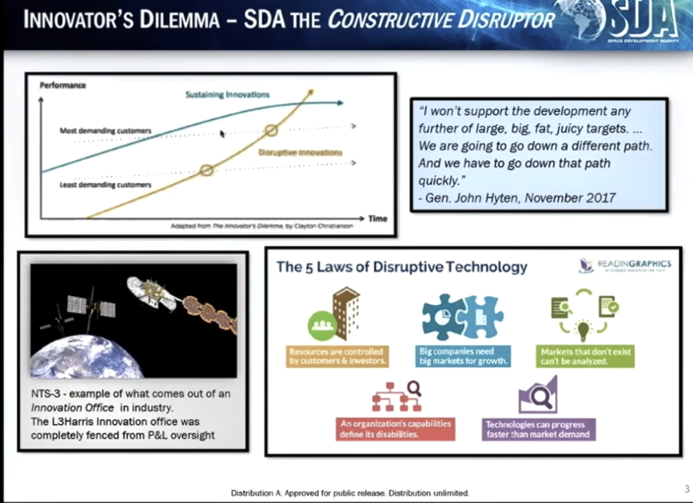 Now one question — why do we need the SDA to do this, I mean, we’ve got the Space Force, we’ve got a lot of different entities and most of you have already talked about this, so I’ll only touch on it briefly, but all boils down to the innovator’s dilemma. The same thing that affects industry affects government, as well. That is, when you have the large entity that is entrenched with delivering to an existing, entrenched customer, they are primarily focused on delivering those capabilities in a low list, incremental approach. And that’s nothing wrong with the large entity, whether that be a large corporation that’s been building a product, or rather that be an organization within the government that is delivering certain products.