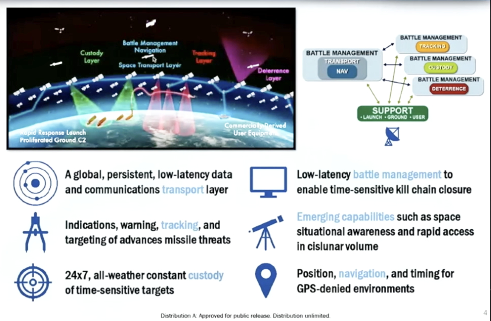 The key things is to get all of those data, get it to the Transport layer, so it can be fused and further disseminated out to the tactical edge, out to the warfighter. Now a lot of that essentially takes some magic, right? That’s what the Battle Management light blue layer is. All of this onboard processing, all of the real-time algorithms that enable this data fusion, automatic target recognition, and network management, all of that is what we call our Battle Management layer. And that is a federated layer that runs on all of the satellites, but primarily the Transport satellites, so that we can do federated processing or cloud processing across all of those satellites to enable the ability to do this computation in real-time.