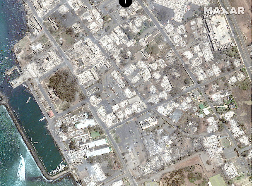 Maui’s fires continue to rage with a report of six dead and landmark areas reduced to ash. Maxar satelllite images compare photos of the same neighborhood on June 25 and the burnt remains of the same area on August 9.