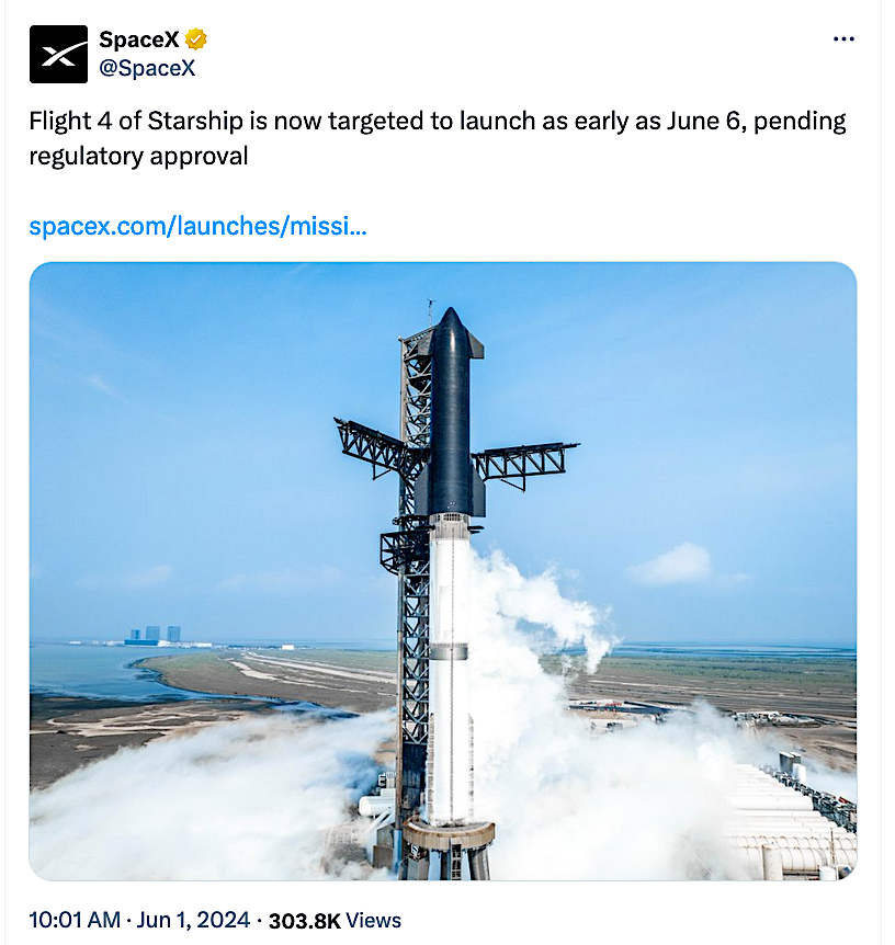 The fourth flight test of Starship could launch as soon as June 6, pending regulatory approval.