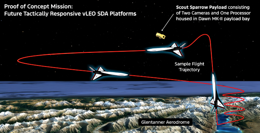 During the proof of concept mission, Scout will calibrate and demonstrate core functionality of the Sparrow sensors integrated into the Mk-II, capturing imagery, diagnostic, and environmental data throughout the mission. This demonstration will highlight the potential of deploying Scout’s secure SDA solutions onboard future Dawn spaceplanes, providing sensor access to unique and crucial operating environments not well served by traditional SDA solutions.