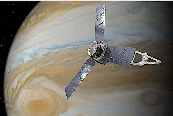 Data received from NASA’s Juno mission indicates the solar-powered spacecraft went into safe mode twice on April 4 while the spacecraft was flying by Jupiter. Safe mode is a precautionary status that a spacecraft enters when it detects an anomaly. Nonessential functions are suspended, and the spacecraft focuses on essential tasks like communication and power management. Upon entering safe mode, Juno’s science instruments were powered down, as designed, for the remainder of the flyby.