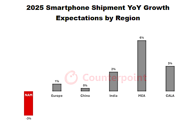 However, most regions will still likely see growth, except North America and China, according to Counterpoint Research’s Market Outlook Smartphone Shipment Forecast Report.