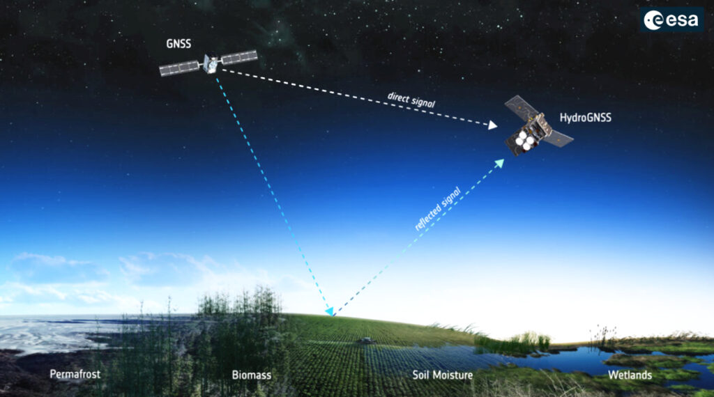 Navigation satellites such as GPS and Galileo transmit L-band microwave signals that change when reflected off Earth’s surface. HydroGNSS will compare these reflected signals with the direct GNSS signals to extract valuable information about geophysical parameters related to the water cycle.