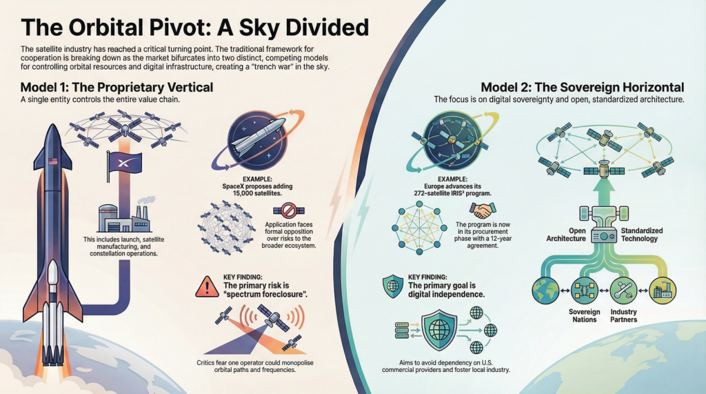 This week’s news exposes a “Sovereign-Commercial Nexus”—a strategic realignment where states are intervening directly to preserve orbital autonomy. In Europe, officials are accelerating “Irisization,” executing a coordinated pivot to reclaim their digital sky. Simultaneously, a regulatory trench war has erupted in Washington. Legacy operators are pressing the FCC to act as a firewall against an unprecedented expansion of private orbital power.