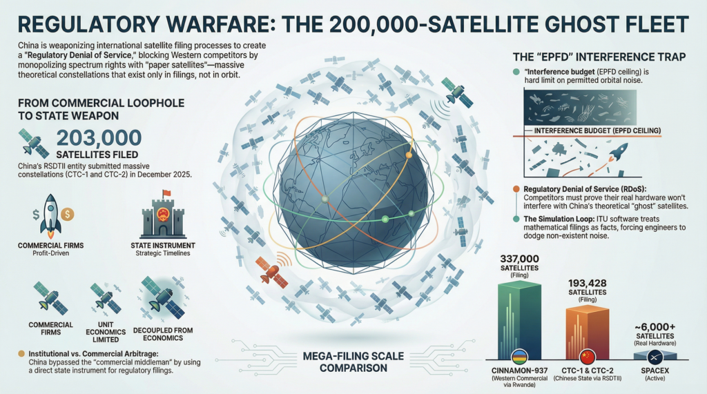 However, the West pioneered the weaponization of this process. Western operators utilized regulatory arbitrage by using small administrations, most famously Tonga, as filing vehicles to secure early coordination priority. The Cinnamon-937 filing, a 337,000-satellite constellation filed via Rwanda in 2021, demonstrated that the ITU’s system could be gamed at extraordinary scale. China did not invent regulatory flooding; they simply industrialized a blueprint drafted by Western speculators.