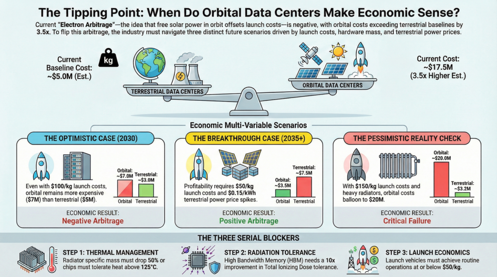 Ultimately, the viability of any Orbital Data Center will be decided by economics. Specifically, by what we might call electron arbitrage: whether the savings from “free” solar power in orbit can offset the enormous cost of putting the hardware there in the first place. If orbital electricity is cheap enough to produce a computational dollar for less than a terrestrial grid charges, the business case opens. If it is not, no amount of engineering elegance can save the venture.