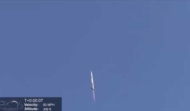 October 26, 2019 — Exos Unsuccessfully launched the SARGE reusable system from Spaceport America. A successful tethered “rocket hover’ test with a new IMU on October 1, 2019, finalized the requirements for return to launch.