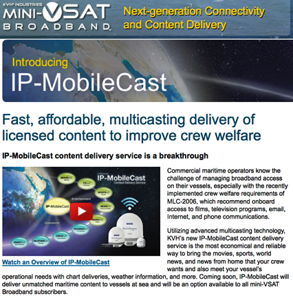 [SatNews] The IP-MobileCast(tm) content delivery service developed by KVH Industries, Inc., (Nasdaq:KVHI) for its mini-VSAT Broadbandsm satellite network is now live, constituting a maritime industry first that will enable seafarers in the middle of the ocean to have affordable access to daily digital newspapers, television news, sports updates, music, new-release blockbuster movies, and TV programs via a multicasting service.