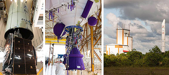 The upper composite with ASTRA 1N is positioned on Arianespace’s Ariane 5 to be launched on July 1, placing it atop BSAT-3c/JCSAT-110R (photo at left). In the two photos at right, preparations begin for the subsequent Ariane 5 mission as its core cryogenic stage is raised for integration, and the first of two solid propellant boosters is moved toward the Launcher Assembly Building.