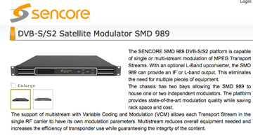 - Sencore has revealed that NES Communications has installed two SMD 989 DVB-S/S2 satellite modulators in its newest HD digital satellite uplink vehicle. NES Communications, a provider of high-quality video and data communications services to major network and sports broadcasters, selected the SMD 989s in order to provide its clients with the full range of modulation options for C-band uplinking. Capable of single or multistream modulation of MPEG transport streams, the Sencore SMD 989 provides frequency-agile IF output, as well as an optional L-band upconverter, which eliminates the need for an external upconverter in L-band distribution scenarios. The SMD 989 chassis has two bays for housing one or two independent modulators, and provides state-of-the-art modulation quality while saving rack space and cost. In addition, the unit's support of multistream with variable coding and modulation (VCM) allows each transport stream in the single RF carrier to have its own modulation parameters. Multistream modulation reduces overall equipment needs by eliminating external multiplexers, while increasing the efficiency of transponder use.