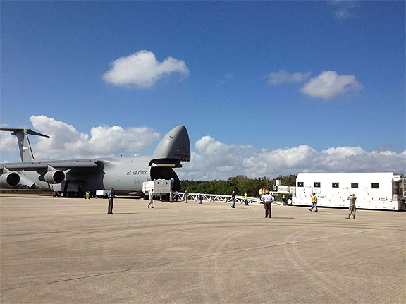 The U.S. Air Force's fourth Wideband Global satellite communication spacecraft arrived at the Shuttle Landing Facility at Kennedy Space Center, Fla., Nov. 15. Photo by Capt. Joseph Maguadog, Military Satellite Communications Systems Directorate, Space and Missile Systems Center.