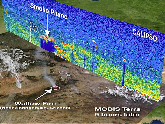 A CALIPSO vertical profile from space shows the smoke plume on June 3, 2011, from the wildfires currently raging in Arizona. It is overlaid on an image captured by the Moderate Resolution Imaging Spectroradiometer (MODIS) instrument on the Terra satellite nine hours later. The data shows that the Wallow Fire smoke plume reached heights of 5 kilometers ( 3 miles) high. CALIPSO and Terra are part of the "A-Train" constellation of five Earth-observing satellites.