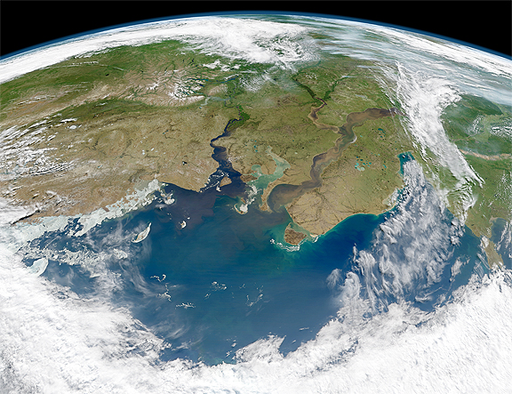 The question for many Arctic researchers is how does that flow change from season to season, and how might it accelerate as far northern latitudes grow warmer. The Ob and Yenisei Rivers in north-central Russia are among the larger rivers that drain into the Arctic Ocean, though past research suggested that they do not necessarily carry as much organic matter and sediment as other rivers. The Moderate Resolution Imaging Spectroradiometer (MODIS) aboard the Aqua satellite acquired this image of the rivers as they dumped tan sediments and dark brown dissolved organic material (DOM) into the Kara Sea on June 29, 2012. Note that the image is rotated to face southeast, such that the North Pole is off the bottom of the image.