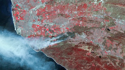 UK-DMC2 image of fires burning in California © DMCii, 2013. Smoke is clearly visble rising from the dark burnscar caused by the fires.