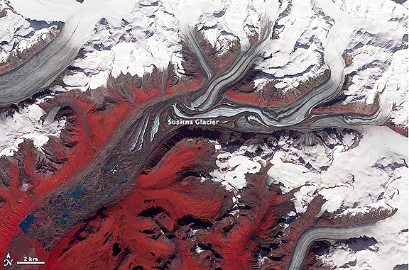 But where water would rush, ice crawls. As a result, glaciers gather dust and dirt, and bear long-lasting evidence of past movements. That was the case on Alaska’s Susitna Glacier on August 27, 2009, when the Advanced Spaceborne Thermal Emission and Reflection Radiometer (ASTER) on NASA’s Terra satellite passed overhead. This false-color image looks similar to an areal photograph, except that vegetation is red. Susitna Glacier’s surface is marbled, combining dirt-free pale blue and dirt-coated dark brown ice. Infusions of relatively clean ice push into the glacier from tributaries flowing from the north. The glacier surface appears especially complex near the center of the image, where ice from a tributary has pushed ice in the main glacier slightly southward.