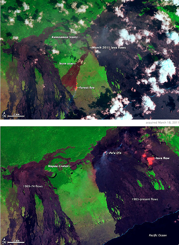 The eruption touched off a forest fire that burned for much of the month and threatened a protected rainforest, according to news reports. After many cloud-covered days, NASA’s Advanced Land Imager (ALI) on the Earth Observing-1 (EO-1) satellite captured a false-color image of the area (top) on March 18, 2011. A similar view from January 16, 2010, is provided for comparison. In the image—which depicts mostly infrared wavelengths of light—vegetation is green, older lava flows are brown to black, and “hot” areas are red. In this case, the scorched land and fresh lava in the burn scar appears slightly red and brown, while the still-burning forest fire appears bright red. In the 2010 image, lava stands out within and near Pu'u 'O'o.