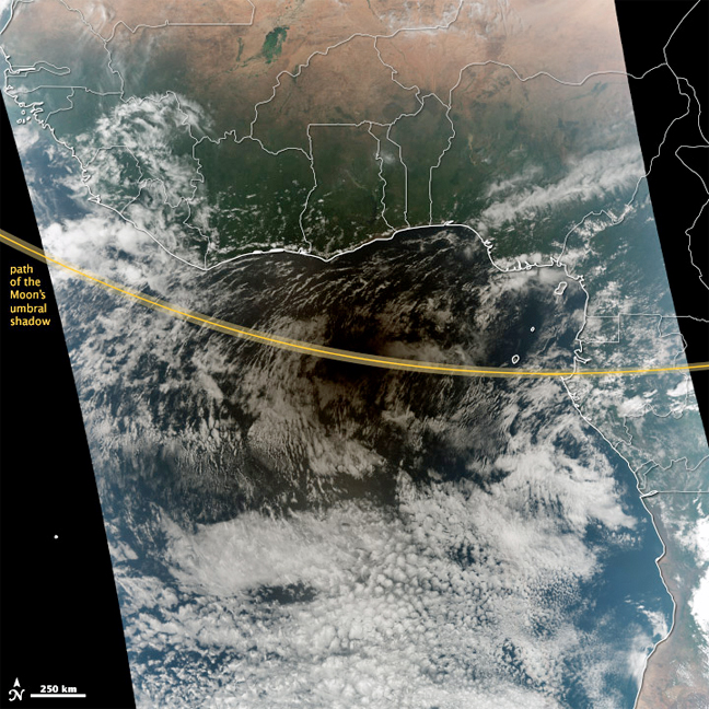 The darkened area is a combination of the umbra (full) and antumbra (partial) shadow of the Moon on Earth’s surface. Skywatchers within the umbra observed a total eclipse that lasted as long as 99 seconds at maximum eclipse, which occurred at 12:47 Universal Time.