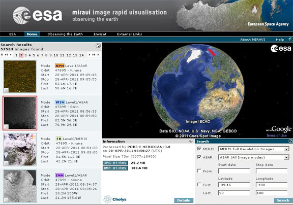 MIRAVI’s new interface allows users to search for Envisat optical and radar images. Either browse the very latest images by clicking on the snapshots to the left, or view a specific location by selecting an area on the world map or entering its geographic coordinates. Credits: ESA, Chelys