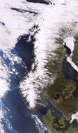 This Envisat Medium Resolution Imaging Spectrometer (MERIS) image, acquired on 23 April 2011 in Full Resolution Mode, shows a sunny Scandinavia in spring, with some snow still present in the elevated areas as well as some sea ice in the Gulf of Botnia.
