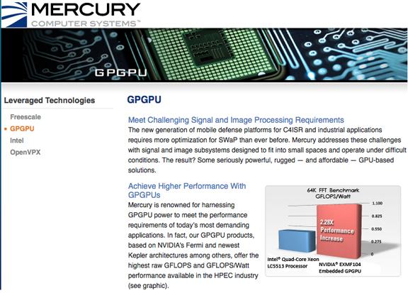 ...streams of sensor data directly to specialized coprocessors such as general purpose graphics processing units (GPGPUs). StreamDirect increases the efficiency of GPGPU-based embedded computing systems, resulting in a three times performance improvement over previous generation GPGPU systems. StreamDirect increases performance by enabling terabytes of raw sensor data to be processed in real-time by optimizing the transfers from the I/O sensors to the GPGPUs, supporting over 10 teraflops (TFLOPS) of processing capability in a rugged OpenVPX™ system. Mercury has previously deployed StreamDirect in a number of programs and it is now being made available in Mercury’s standard product—the 6U OpenVPX GSC6201. The GSC6201 is a carrier card that incorporates industry-standard GPGPU MXMs and is designed to accept those based on the NVIDIA Fermi™ and recently launched Kepler™ architectures.
