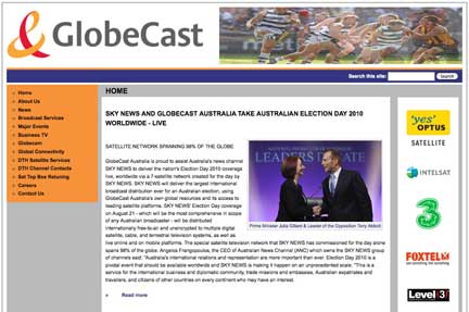 GlobeCast Australia is proud to assist Australia's news channel SKY NEWS to deliver Australia's Election Day 2010 coverage live, worldwide, via a 7-satellite network created for election day by SKY NEWS.
