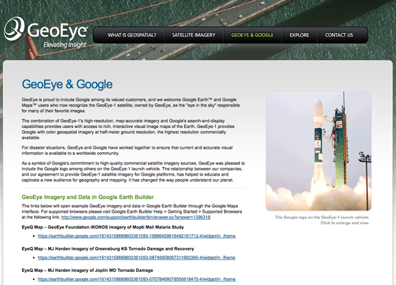 GeoEye, Inc. (NASDAQ: GEOY) has signed a multi-year enterprise agreement with Google Inc. (NASDAQ: GOOG) to license access to Google Earth Builder, Google’s cloud-based map publishing platform. GeoEye is making this investment as part of its strategy to increase online access to its high-resolution color imagery. GeoEye will be using Google Earth Builder to deliver a new set of imagery services that will make it easy for any Google Earth™ or Google Maps™ user to access imagery across GeoEye’s vast archive. GeoEye will position these new imagery services as an extension of its EyeQ™ online access portfolio. Since 2008, GeoEye has worked with Google to publish millions of square kilometers of GeoEye-1 imagery to Google Earth and Google Maps. Google users have been able to take advantage of GeoEye’s high-resolution satellite imagery to gain unique insight into our world. GeoEye is investing in Google Earth Builder because it provides a simple way to address the needs of many government and commercial customers who want access to GeoEye’s broader archive and recent new collections. With over one billion downloads of Google Earth to date, this provides GeoEye a simple way to make its imagery accessible to a broader audience.