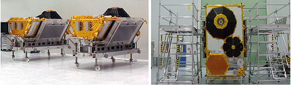 Two of the six trapezoidal-shaped Globalstar satellites for next February’s Soyuz mission are shown in the Starsem clean room facilities at Baikonur Cosmodrome (photo at left). A head-on image details the Earth-facing side of Globalstar’s second-generation spacecraft (image at right).