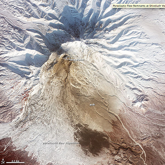 This false-color satellite image from the Advanced Spaceborne Thermal Emission and Reflection Radiometer (ASTER) on the Terra satellite shows the remnants of a large pyroclastic flow on the slopes of Shiveluch Volcano. Fortunately, no one was hurt during the eruption and flow in the sparsely-populated area. ASTER detected heat from the flow during or shortly after an event on January 25, 2011. Note how the heat signatures from January line up with the dark surface deposits visible on February 25; those deposits cover more than 10 square kilometers (4 square miles). Light brown ash covers the snow above the flow deposits, and a tiny plume rises from Shiveluch’s growing lava dome. Vegetation surrounding the volcano is colored dark red.