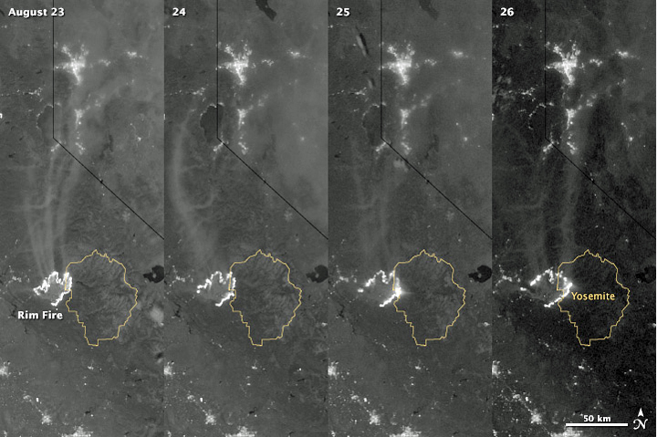 The Visible Infrared Imaging Radiometer Suite (VIIRS) on the Suomi NPP satellite tracked the growth of the fire between August 23–26. The VIIRS day-night band is extremely sensitive to low light, making it possible to see the fire front from space at night. The brightest, most intense parts of the fire glow white, exceeding the brightness of the lights of Reno, Nevada, to the north. Pale gray smoke streams away from the fire, generally to the north.