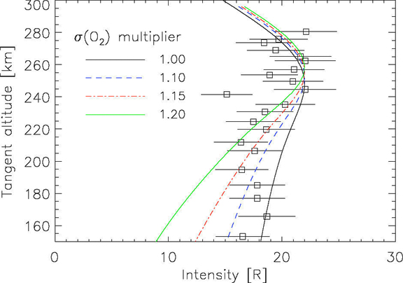 This graph, a 61.7 nm profile measured by RAIDS, is compared to the current model. Allowing for variations in absorption (σ) by O2 indicates that neutral composition used in the model may be in error by ~15%. Thus, the accuracy of algorithms used to infer ionospheric density can be improved by using the 61.7 nm emission directly.