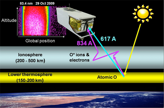 This image shows a schematic representation of the dayside ionosphere remote sensing concept, using measurement of the scattered 83.4 nm emission to infer ionospheric densities. Measuring the 61.7 nm emission provides direct information on the intensity of the source region in the lower thermosphere that is currently only modeled for operational algorithms.