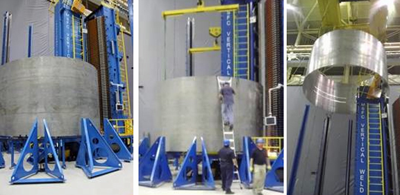 Left: Dynetics' first 18' diameter SLS advanced booster demonstration cryo tank barrel on the Marshall Space Flight Center Vertical Weld Tool