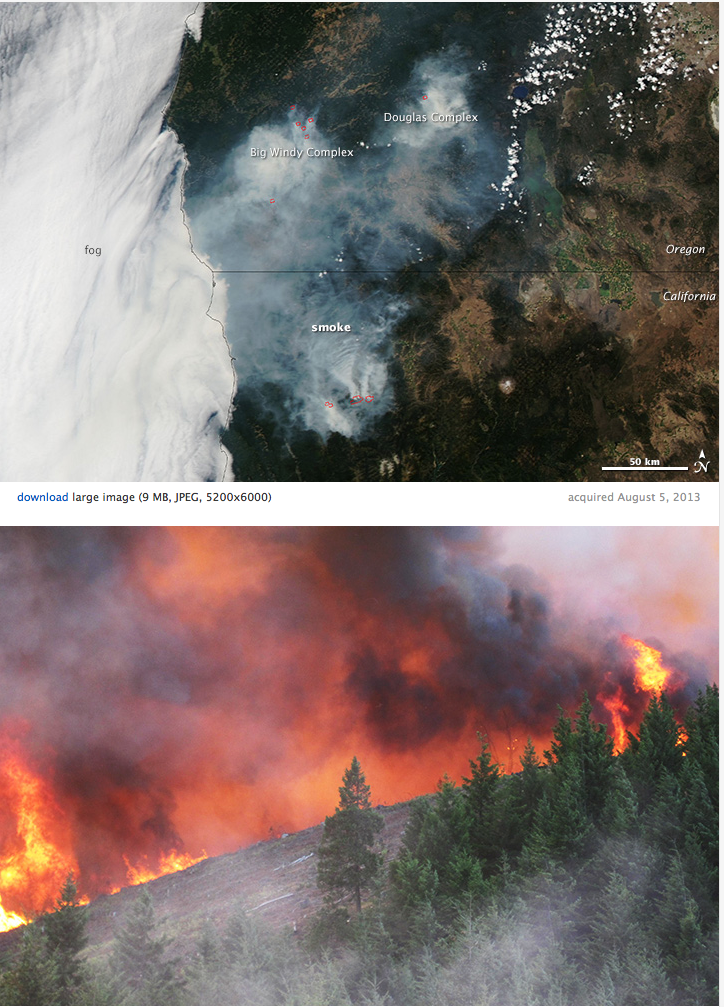 On August 5, 2013, the Moderate Resolution Imaging Spectroradiometer (MODIS) on Aqua captured the top image, which shows smoke rising from the Douglas Complex fire and the Big Windy Complex fire in southern Oregon. To the south, the Salmon River Complex fire and Orleans Complex fire burned in northern California.