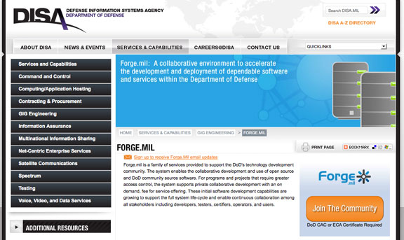 The Defense Information Systems Agency’s newest capability in the Forge.mil family of services is Forge.mil Community. Community is a social networking layer that provides additional capabilities to SoftwareForge and ProjectForge. Forge.mil Community will help users to connect, collaborate, share information and manage content and to provide a more holistic view of Forge.mil activities. While project teams on Forge.mil tended to focus on their individual projects, the Forge.mil program office recognized a need to improve the communication between teams and individuals sharing a common purpose and those discussing and working to solve similar challenges that transcend a single project or set of projects. The ability to organize within a group or sub-community and then associate a project or a set of projects provides a broader view of software development activity to all stakeholders. Forge.mil Community allows for the formation of groups built around communities of interest, organizations, mission areas, or specific technologies as well as groups created around topics of interest to the information technology acquisition community.