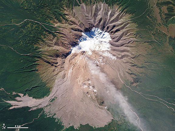 It has been spewing ash and steam intermittently — with occasional dome collapses, pyroclastic flows, and lava flows, as well — for the past decade. Shiveluch is a stratovolcano, a steep-sloped formation of alternating layers of hardened lava, ash, and rocks thrown out by earlier eruptions. A lava dome has been growing southwest of the 3,283-meter (10,771-foot) summit. The Advanced Land Imager (ALI) on NASA’s Earth Observing-1 (EO-1) satellite acquired this image on September 7, 2010. Brown and tan debris — perhaps ash falls, perhaps mud from lahars — covers the southern landscape of the volcano, while the hills on the northern side remain covered in snow and ice.