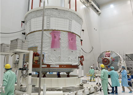 The ATV Edoardo Amaldi’s two major components are shown during initial checkout activity in the S5C preparation hall: the Service Module, in the foreground; and the Integrated Cargo Carrier in the background. Photo courtesy of Arianespace