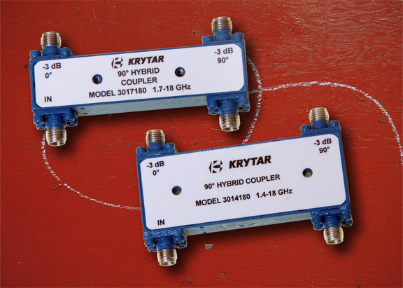 ...3dB of coupling over the broadband frequency range of 1.4 to 18.0GHz and 1.7 to 18.0GHz in single compact packages. KRYTAR hybrid couplers are designed to perform many functions, including splitting and combining signals in amplifiers, switching circuits, and antenna beam-forming networks used in a wide range of commercial and military applications. KRYTAR’s new hybrid coupler Model 3014180 delivers excellent versatility from 1.4 to 18.0GHz with excellent phase and amplitude matching. Typical specifications include Amplitude Imbalance: ±1.0dB; Phase Imbalance is ±10 degrees; Isolation is >12dB; Maximum VSWR: 1.70; Insertion Loss is <2.6dB.