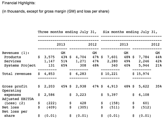For the second quarter of Fiscal 2014, total revenues were $4.9 million, a decrease of 23 percent or $1.4 million from the prior period. The total gross margin for the quarter declined to 45 percent from 47 percent for the comparable prior period, primarily due to lower volume of sales to cover current manufacturing-related overhead costs.