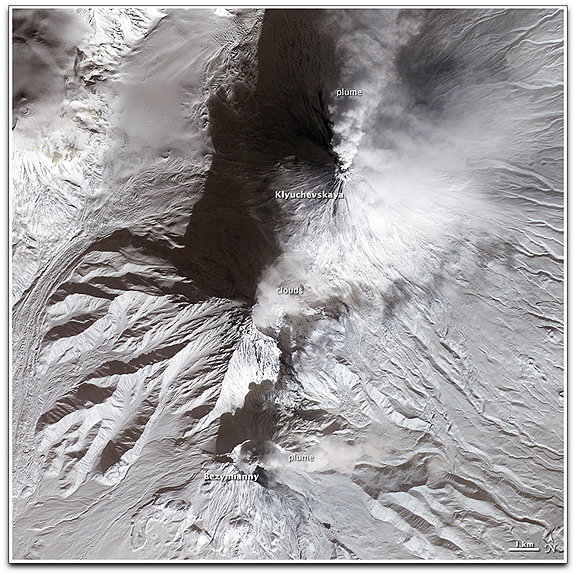 The Advanced Spaceborne Thermal Emission and Reflection Radiometer (ASTER) on NASA’s Terra satellite captured this false-color image on February 13, 2010. Low-angled sunlight illuminates the southern slopes of Kamchatka’s rugged landscape, as well as the southern sides of both volcanic plumes. The plumes’ light color suggests that, of the visible material in each plume, steam predominates over volcanic ash. Both plumes cast shadows toward the northwest.