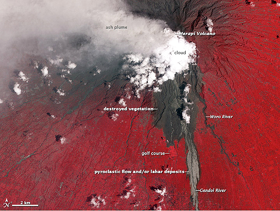This false-color satellite image from the ASTER instrument on NASA's Terra satellite shows evidence of a large pyroclastic flow along the Gendol River south of Mount Merapi. Light gray volcanic deposits (either from pyroclastic flows or lahars) fill the course of the Gendol. Just north of the Merapi Golf Course (light red feature) is a much wider area where a pyroclastic flow spread across the landscape, causing almost total devastation. Within this dark gray area, most of the trees were knocked down and the ground was coated by ash and rock. The flow deposits are largely surrounded by healthy vegetation, colored bright red. A light gray ash plume extends the west of the volcano, guided by the prevailing winds. Near the plume, heavy ashfall has coated the fields and forests, coloring them dull red to gray.