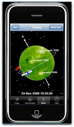 The name of the app is "3D Sun" and it may be downloaded free of charge at Apple's app store. Just enter "3D Sun" in the Store's search box or visit http://3dsun.org for a direct link. Here's the 3D Sun on the iPhone. You can spin the sphere by flicking it and zoom in by pinching the screen.