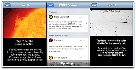 Representative screenshots from the app--from left to right, a prominence caught in mid-eruption by STEREO-B, a sample of the daily news screen, and a sungrazing comet movie recorded by STEREO-A.