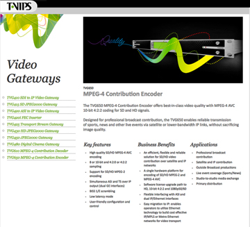 T-VIPS, a global leader in professional video contribution and distribution solutions, recently launched the TVG650, an MPEG-4 Contribution Encoder, and the TVG610, an MPEG-4 Contribution Decoder. Both products will ship in Q4. The TVG610 and TVG650 are part of T-VIPS’ Video Gateway line of compact, powerful and cost-effective products designed for real-time contribution. The new products are high-end, flexible solutions, handling the encoding and decoding of MPEG- 4, 4:2:2, 10-bit video, supporting output on ASI and IP/Ethernet. Key features include: