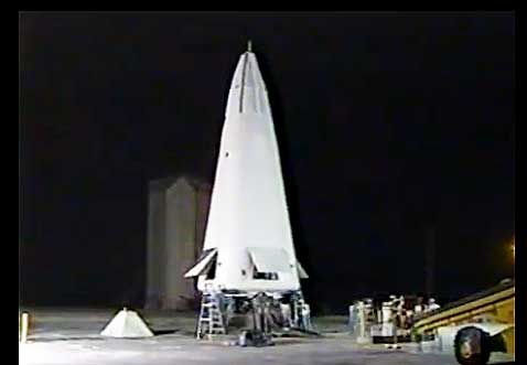The DC-X was developed and built by McDonnell Douglas for the Ballistic Missile Defense Organization as an unmanned prototype for a reusable single stage to orbit launch vehicle.