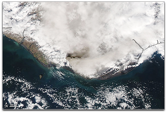 On May 16, 2010, the Iceland Meteorological Office reported that Eyjafjallajökull’s plume reached a height of 7 to 9 kilometers (24,000 to 30,000 feet), blowing southeast and east-southeast. Ashfall had been observed southeast of the volcano’s summit. More than 150 lightning strikes had been recorded above the volcano between May 15 and 16. As it had in earlier bulletins, the Iceland Meteorological Office warned that the volcano gave no indication that its eruptive activity was slowing.