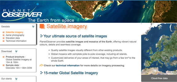 ...for PlanetObserver value-added geospatial data that will be distributed by the Toulouse-based Telespazio sales team. PlanetObserver produces satellite imagery and terrain products with a global coverage—the Company's global imagery dataset offers 15m resolution, processed from Landsat 7 ETM+ data, offers a complete and substantially cloud-free coverage with vibrant natural colours. PlanetObserver global Digital Elevation Model (DEM), with 90m resolution worldwide, is a unique dataset offering reliable information on all relief areas.